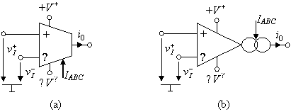 Exista mai multe modelari ale amplificatoarelor operationale transconductanta. Cea mai des folosita modelare a OTA este prezentata in figura 3.40. Modelarea efectelor generate de abaterile de la idealitate se realizeaza similar ca in cazul amplificatoarelor operationale, cu generatoare de eroare la intrare.