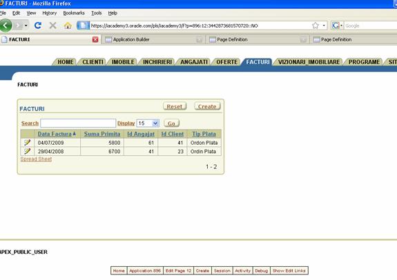 Pentru a introduce date in table, se apasa butonul Create.Se pot introduce data facturii, suma primita, tipul platii, iar id-ul angajatului si id-ul clientului sunt selectate dintr-o lista de valori a angajatilor,respectiv ,a clientilor.