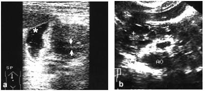 Pancreas inelar: a. (asterisc - lumenul duodenal dilatat; sageti - lumenul duodenal stenozat); b. boala pancreatica multichistica
