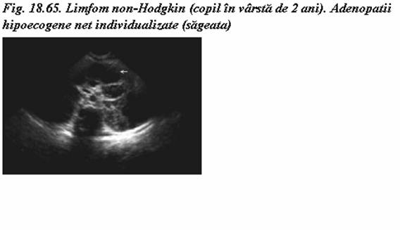 Limfomul Hodgkin (LH). Boala este definita histopatologic prin prezenta de celule Reed-Sternberg in ganglionii afectati. Clinic, se caracterizeaza printr-un debut insidios, cu aparitia unor adenopatii cu crestere lenta si de consistenta crescuta, dar elastice, mobile, nedureroase, in majoritatea cazurilor situate latero-cervical. Uneori, pot aparea sindroame de compresiune: mediastinal, cav, medular, radicular. Modul de extindere a bolii este relativ previzibil, initial pe cale limfatica prin contiguitate, ulterior pe cale hematogena. Extinderea limfatica se face axial, urmarind principalele conexiuni anatomice dintre ganglioni: cervical inalt cervical inferior axilar; mediastinal cervical axilar; axilar cervical; inghinal abdominal cervical axilar. Primul organ interesat pe cale hematogena este splina, ulterior ficatul, maduva osoasa si alte organe. Aprecierea extinderii bolii este esentiala in orientarea tratamentului si se face printr-o baterie complexa de investigatii biologice si imagistice, ecografia abdominala fiind o explorare utila pentru stadializare. Stadializarea folosita pe scara larga, atat in LH, cat si pentru limfomele non-Hodgkin, este asa-numita stadializare Ann-Arbor, conform careia se disting patru stadii .