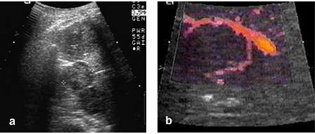 Hepatocarcinom incipient: a. si b. nodul hipoecogen; c. Vascularizatie tumorala (explorare power); d. semnal vascular arterial (examinare Doppler pulsat)