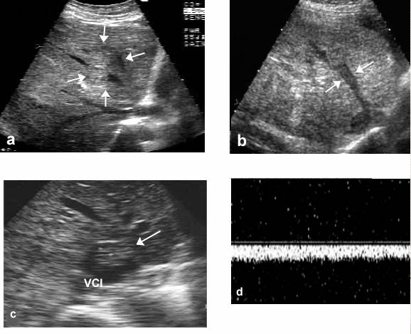 Modele ecografice de tromboza maligna a venelor hepatice: a. invazie tumorala intrahepatica (sageti); b. tromboza maligna a venei hepatice medii (sageti); c. tromboza intrahepatica cu prolabare in vena cava inferioara; d. spectru venos monofazic
