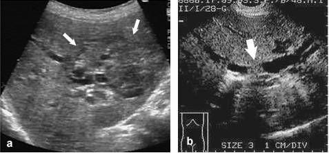 Hepatoblastom: a. tumora hipoecogena (sageti); b. invazie portala (sageata)