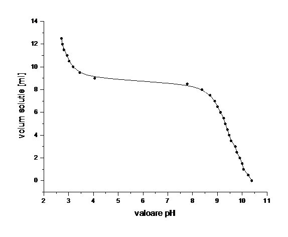Pentru procesul de titrare potentiometrica se folosesc 10 ml solutie amoniac 0,1M cu pH-ul 9,2. La adaugarea constanta a cate 0,5 ml HCl, vom obtine datele urmatoare: