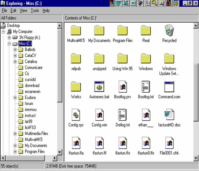 Windows contine un instrument nou, programul Windows Explorer, pe care il puteti utiliza pentru a vedea cum sunt organizate fisierele si dosarele de pe calculatorul dumneavoastra. Puteti trece in revista aranjarea ierarhica a dosarelor si puteti privi in fiecare, pentru a vedea fisierele stocate in ele. De asemenea, puteti utiliza Exploratorul la reorganizarea si gestionarea fisierelor si a dosarelor. Puteti crea noi dosare; puteti copia si muta fisierele dintr-un dosar in altul, pe un floppy disc sau pe un alt calculator (daca sunteti intr-o retea); puteti redenumi si sterge fisierele si dosarele; puteti executa alte activitati de gestionare a fisierelor.
