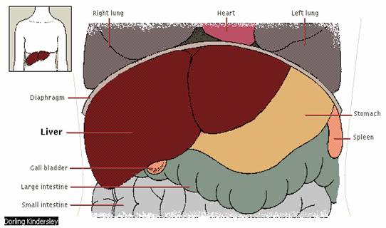 localizati chiar sub diafragma, in partea drepta a corpului. Poate pierde